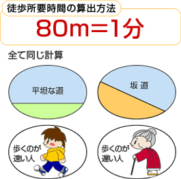 不動産の広告では80mを1分として駅までの所要時間を表示しています。